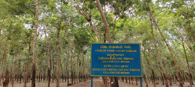 Công ty Cổ phần đầu tư cao su Đắk Lắk (DRI) hiện đang quản lý vườn cây cao su tại Lào với diện tích là 8.588,69 ha thông qua Công ty con (sở hữu 100% vốn) là Công ty TNHH Cao su Đắk Lắk (DAKLAORUCO) có trụ sở tại Thành phố PakSe, Tỉnh Champasak. Tháng 11 năm 2024 Công ty con DAKLAORUCO đã được tổ chức chứng nhận GFA cấp chứng chỉ FSC-FM/CoC (GFA-FM/CoC – 007800) với diện tích 6.849 ha bao gồm diện tích vườn cây cao su là 6.148 ha, diện tích hành lang bảo vệ ven suối; mẫu đại diện sinh thái bản địa là 697 ha.