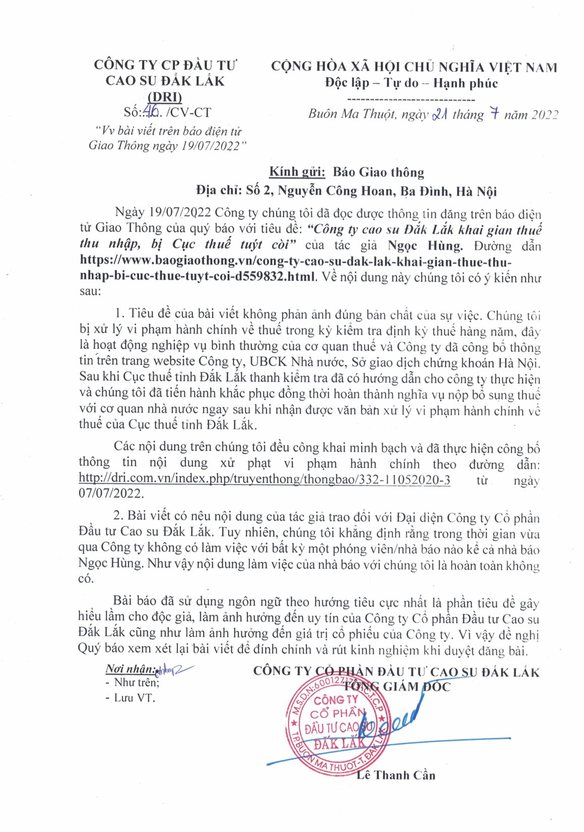 DRI công bố thông tin về việc chốt Danh sách cổ đông để lấy ý kiến cổ đông bằng văn bản: Thông báo số 40/TB-CT ngày 26/07/2022 "Thông báo về ngày đăng ký cuối cùng để thực hiện quyền lấy ý kiến cổ đông bằng văn bản"