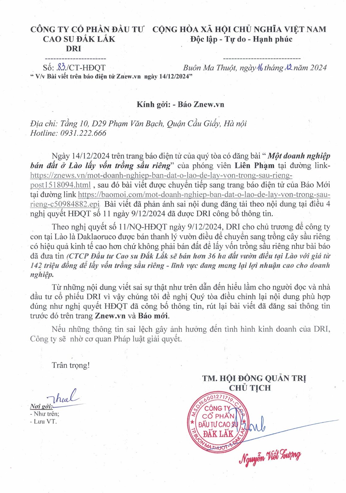 Thông báo giao dịch cổ phiếu của Công ty Cổ phần Cao su Đắk Lắk - Cổ đông lớn, Người có liên quan của người nội bộ (tháng 12/2024)
