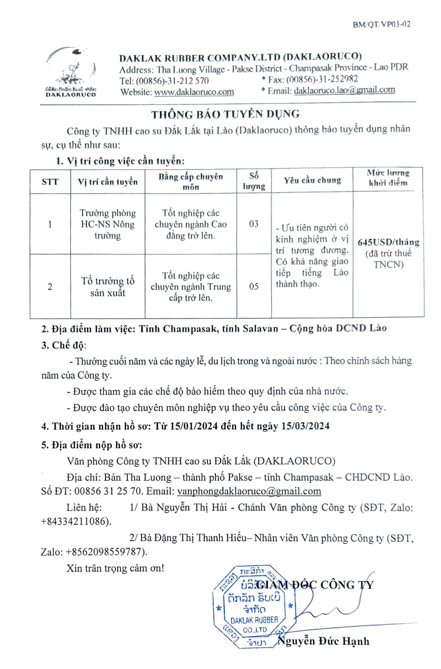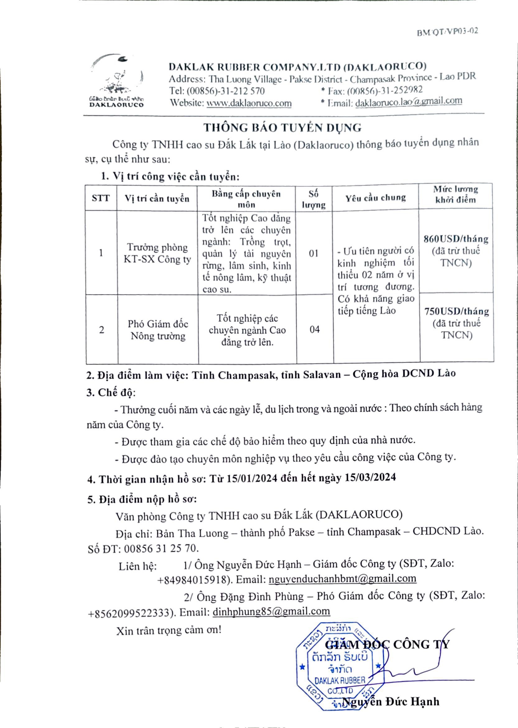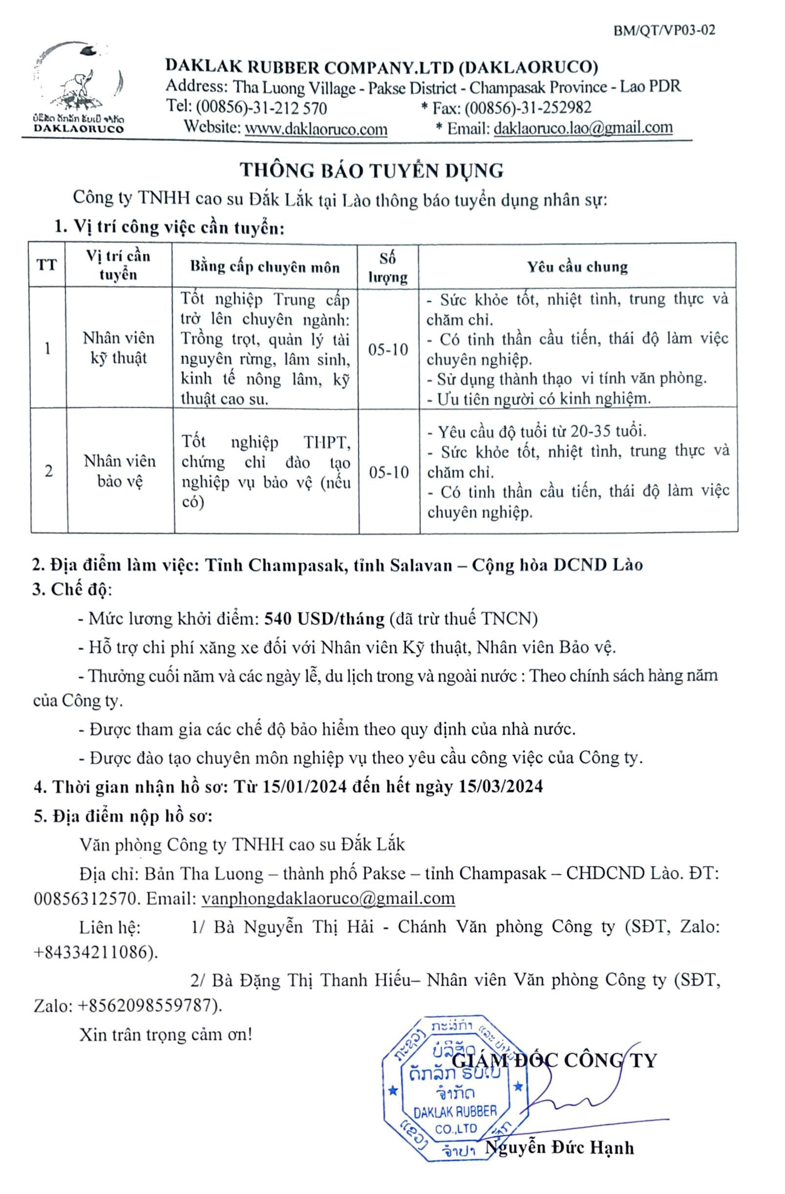 Công ty DRI thông báo tuyển dụng nhân sự làm việc tại Công ty TNHH cao su Đắk Lắk tại Lào.